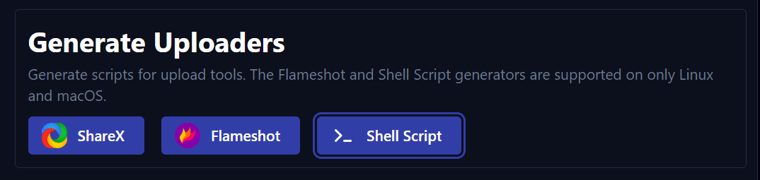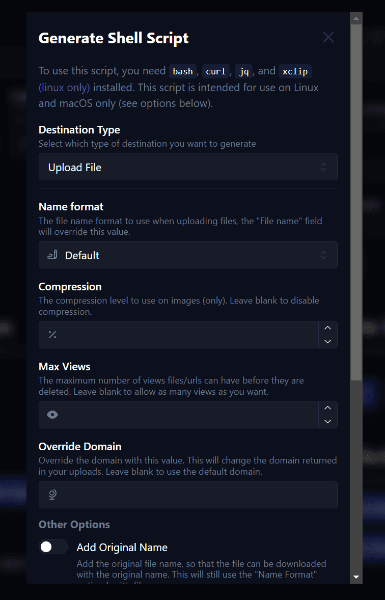 This guide will show you how to generate a shell-script that takes an argument (file/url) and uploads it to Zipline.